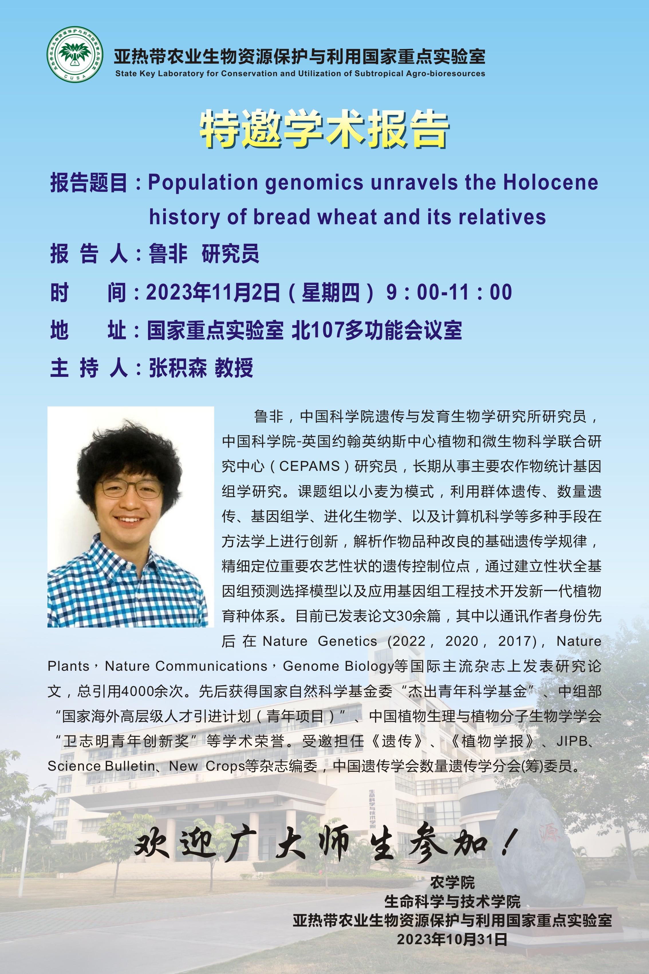 特邀学术报告:Population genomics unravels the Holocene history of bread wheat and its relatives
