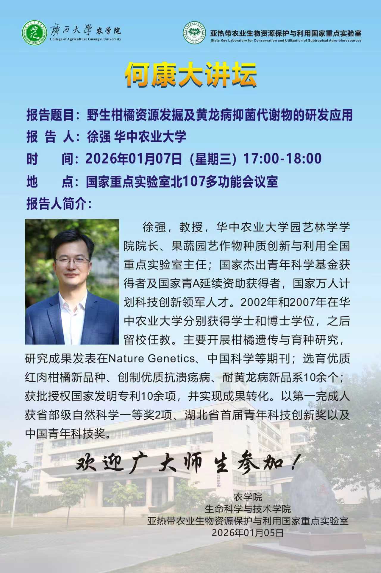 何康大讲坛:野生柑橘资源发掘及黄龙病抑菌代谢物的研发应用(徐强 教授)