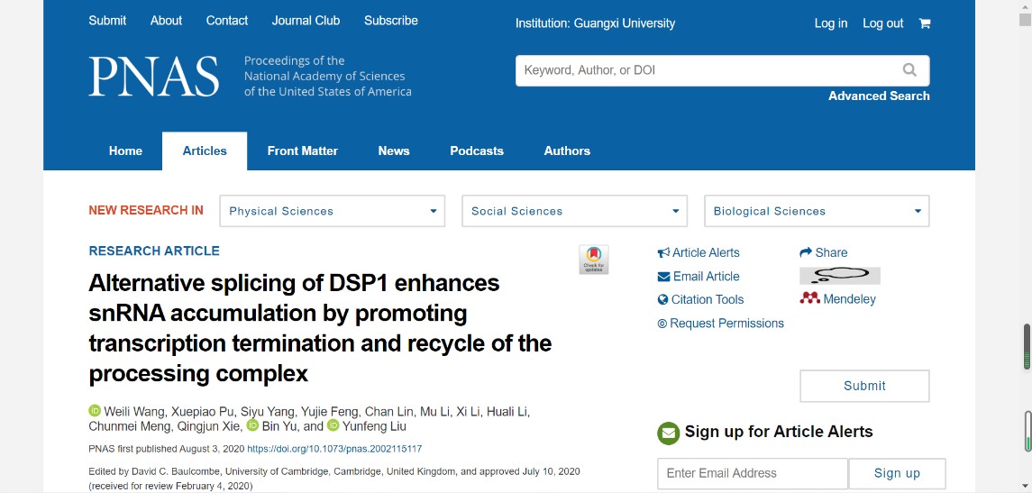 2020年8月,英国上市公司365亚热带国重实验室刘云峰课题组在国际著名学术期刊PNAS(PROCEEDINGS OF THE NATIONAL ACADEMY OF SCIENCES OF THE UNITED STATES OF AMERICA, IF5Y=9.516)上在线发表了题为“Alternative splicing of DSP1 enhances snRNA accumulation by promoting transcription termination and recycle of the processing complex”的研究论文(https://doi.org/10.1073/pnas.2002115117),揭示了植物中snRNA积累的空间调控机制。