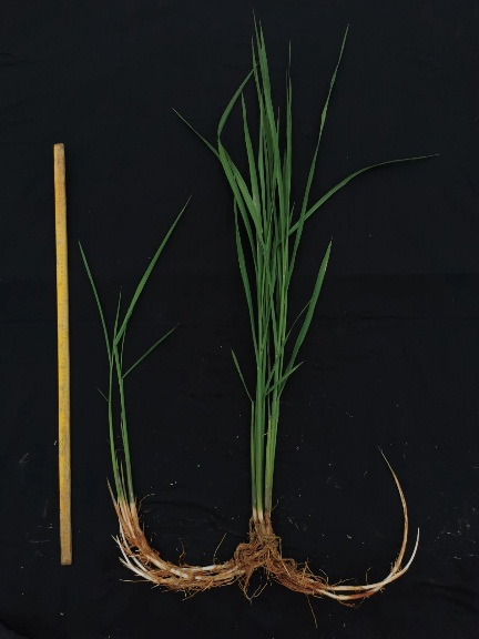 杨江义课题组克服重重困难,以长雄蕊野生稻和亚洲栽培稻分别为父本和母本进行不完全双列杂交,分析了亲本的一般配合力和特殊配合力对根状茎发育的影响,发现母本的一般配合力显著影响杂交F1代根状茎长短,而杂交组合间的特殊配合力对杂交F1根状茎影响不显著【1】。这说明,想要获得具有根状茎的栽/野稻杂交F1,栽培稻的选择至关重要。在对根状茎表型进行考察时,考虑到同一植株各根状茎长度(Rhizome length)变幅很大,改为采用更稳定的根状茎扩展距离(Rhizome extension distance)作为根状茎表型。这也是国际上首次获得的长雄蕊野生稻跟栽培稻的双列杂交后代,为根状茎研究奠定了坚实的材料基础。从中挑选出根状茎表达强且套袋自交结实率高(易于扩大研究群体)的杂交F1(图1)用于后续研究。