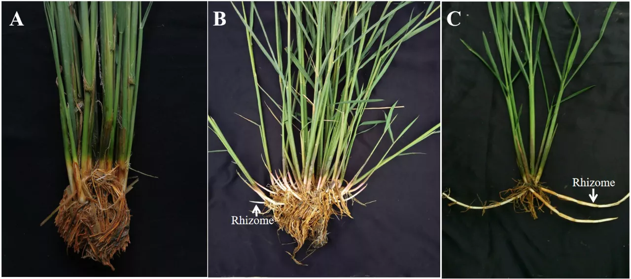 重要的粮食作物如水稻、小麦和玉米都是一年生禾本科植物。相较于一年生作物,多年生作物生长周期更长、根系入土更深、能够截留利用更多的降水,从而在固碳、防止土壤侵蚀和维持土壤生态系统健康等方面具有优势【3】。根状茎(rhizome,比如竹鞭、高粱七、芦根、白茅根、藕带等)是一种在土壤中横向生长的类似根的地下茎,是禾本科植物实现多年生的关键器官,它使得许多植物能够熬过恶劣的环境条件【4】。根状茎在土中横向生长一段距离后就上翘,长出土面成为新植株。对植物地上茎的研究比较多,而对地下茎的研究则少得多。鉴定根状茎调控基因,不仅有利于多年生谷物、饲料和草坪草的培育,还有助于控制入侵性的多年生杂草。但到目前为止,植物根状茎发育调控基因还未被鉴定或克隆。低效益、高风险、土地流转困难等因素打击年轻人的种粮积极性,我国粮食生产后续乏人。培育多年生水稻将有助于降低种粮成本,减少劳动力投入,适合空心村的水稻生产。此外,水稻作为一种模式植物,其根状茎研究方法和成果将有助于其他植物的根状茎研究。