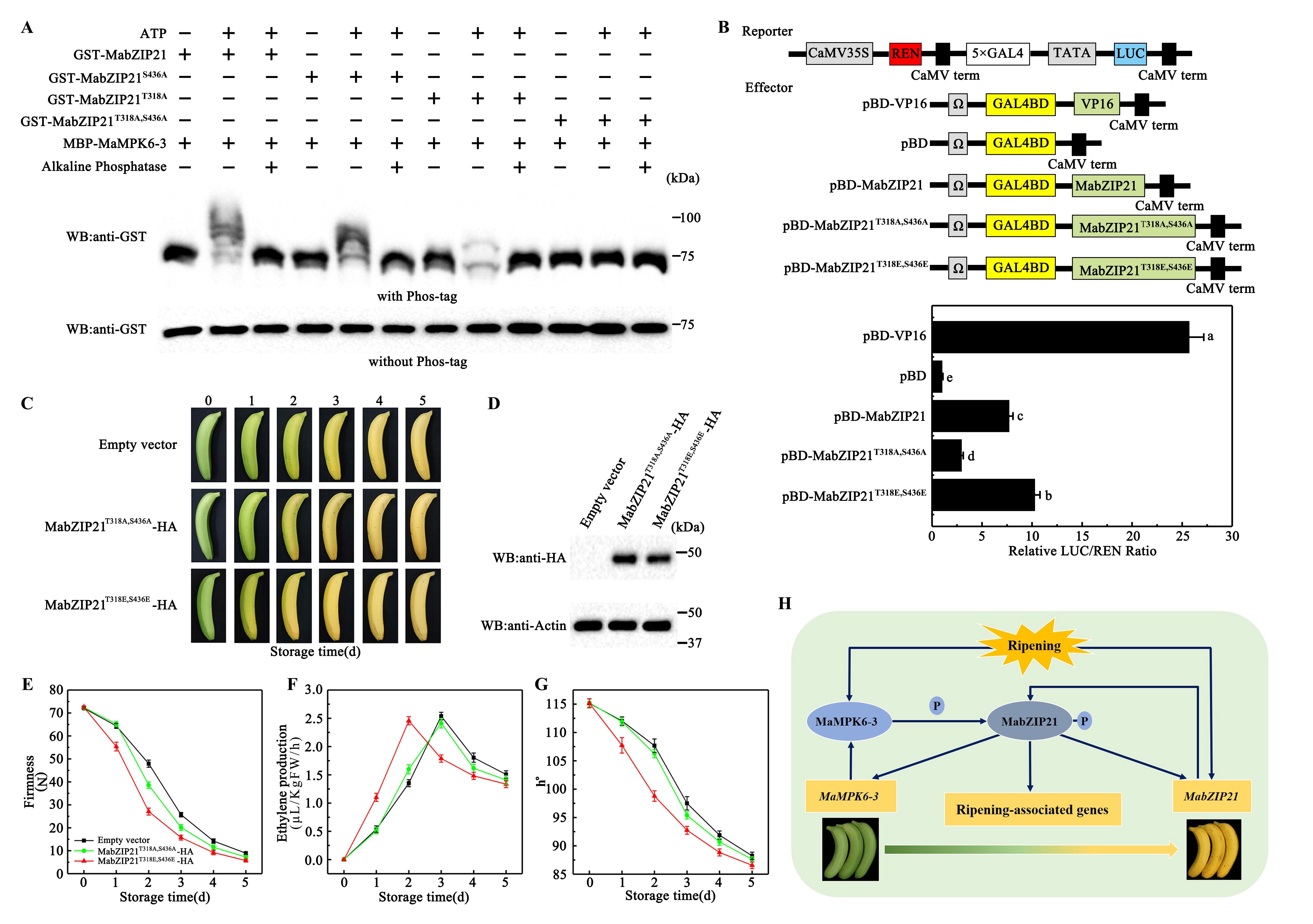 图1. MabZIP21的磷酸化修饰调控采后香蕉果实成熟的机制