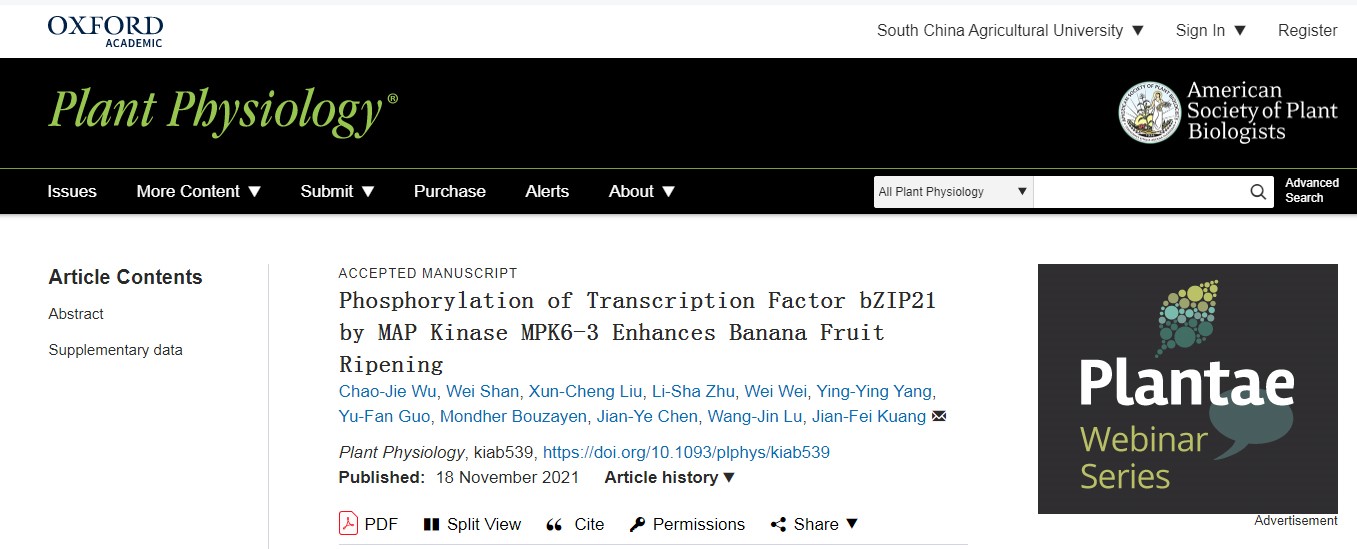 近日,我室陆旺金教授和陈建业教授团队在国际著名期刊Plant Physiology(植物学Top期刊,2020年影响因子8.34)在线发表了题为“Phosphorylation of Transcription Factor bZIP21 by MAP Kinase MPK6-3 Enhances Banana Fruit Ripening”,在线网址:https://academic.oup.com/plphys/advance-article/doi/10.1093/plphys/kiab539/6430993?searchresult=1。论文第一作者为园艺学院2019级博士研究生吴超杰,通讯作者为邝健飞研究员,中国科学院华南植物园刘勋成副研究员和法国图卢兹大学Bouzayen Mondher教授参与了该项研究工作。该论文获得了国家自然科学基金、广东特支计划科技创新青年拔尖人才、财政部和农业农村部国家香蕉现代农业产业技术体系项目的资助。