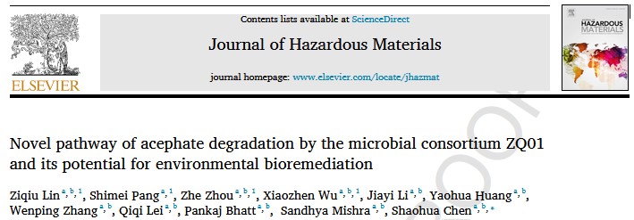 近日,我室陈少华课题组在国际知名环境科学与生态学学术期刊《Journal of Hazardous Materials》(IF=10.588,一区Top期刊)在线发表题为“Novel pathway of acephate degradation by the microbial consortium ZQ01 and its potential for environmental bioremediation”的研究论文(论文链接:https://www.sciencedirect.com/science/article/pii/S0304389421028107?via%3Dihub)。