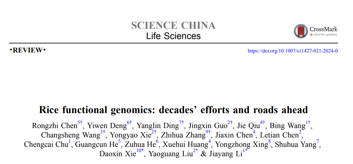 近日,亚热带农业生物资源保护与利用国家重点实验室、华南农业大学生命科学学院刘耀光院士联合中国科学院遗传发育所李家洋院士、清华大学谢道昕院士等国内20位专家共同撰写题为“Rice functional genomics: Decades’ efforts and roads ahead” 的水稻生物学研究大综述,并在线发表于SCIENCE CHINA Life Science(IF=6.038)。该综述参考了648篇水稻研究文献,以3万余字和10张调控网络图,全面系统地总结了近年来在水稻生物学研究中取得的重要进展。该综述涵盖了水稻生物学7个方面的研究:1、组学与全基因组关联研究;2、激素与发育;3、营养元素利用;4、非生物胁迫;5、生物胁迫;6、光敏抽穗期;7、杂交稻育性控制。该重磅综述必将对水稻生物学研究和分子育种有重要的指导和促进作用。全文由李家洋、刘耀光和谢道昕3位院士担任共同通讯作者,由我校郭晶心研究员、谢勇尧副教授等8位一线水稻科研人员为担任共同第一作者,陈乐天教授也是该文的共作者之一。