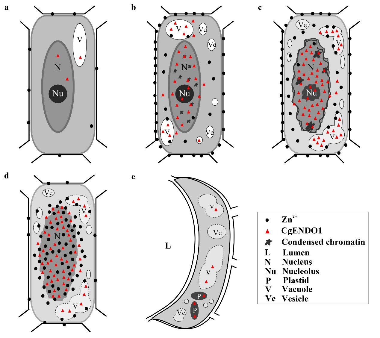 在细胞PCD的过程中,细胞核的降解是不同核酸酶共同协同作用的结果。课题组在前期揭示钙依赖核酸酶作用机制的基础上,进一步报道了柑橘属药用植物化橘红中一个锌离子依赖的核酸酶CgENDO1,其在酸性和中性pH下,可依赖Zn2+降解线性双链DNA,CgENDO1可能依赖Zn2+参与柑橘属果实分泌囊细胞PCD中的核降解过程(图1)。研究对深入探讨钙离子依赖的核酸酶和锌离子依赖核酸酶在植物细胞PCD中的协同作用提供了全新的细胞和分子调控资料。