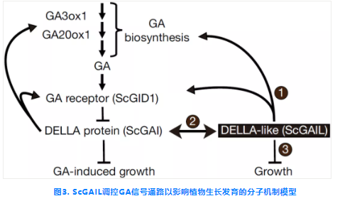 综上,该研究揭示了DELLA-like蛋白通过影响GAs合成、抑制DELLA蛋白降解以及与其他蛋白互作来调控植物发育的机制(图3)。这种调控机制可能有利于植物更好地适应GA信号响应,尤其是对于仅含有一个DELLA蛋白的植物。DELLA蛋白已被广泛证实通过与其他植物激素串扰以及与各种关键调控蛋白互作来调节GA介导的植物生长和胁迫响应。对ScGAIL的研究为作物育种提供了新的候选靶标,并为植物GA信号代谢提供了新思路。
