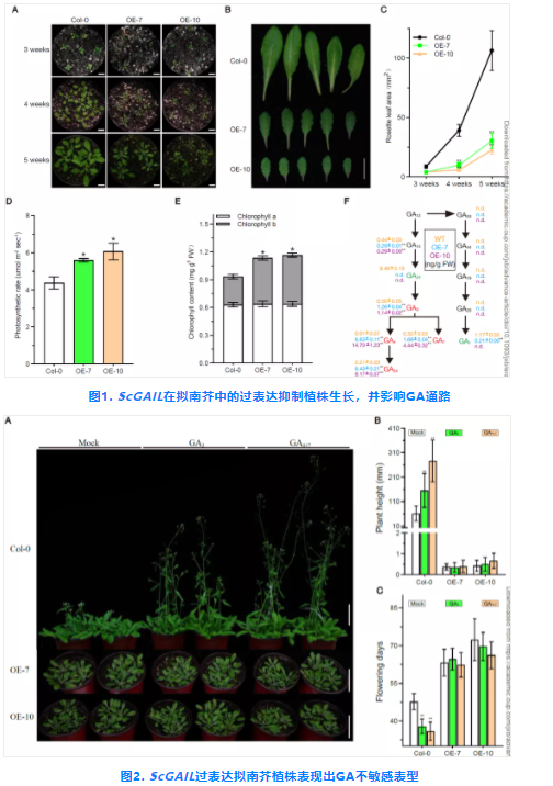 本研究在对ScGAI基因cDNA克隆过程中发现了较短序列的ScGAI-like(ScGAIL),与ScGAI相比其N端缺失了341 bp,因此编码缺乏N端DELLA结构域的蛋白。除此之外,ScGAIL与ScGAI其他序列高度同源。与ScGAIL细胞质和细胞核定位不同,ScGAI仅位于细胞核内。GA处理1小时后,ScGAIL的表达相较于ScGAI显著上调。ScGAIL在拟南芥中的过表达导致株高显著降低,叶面积减小,开花延迟,光合速率以及叶绿素b含量增加。与野生型相比,ScGAIL过表达株系中的生物活性GA1含量显著降低,而GA4和GA7含量显著增加(图1);GA受体基因AtGID1a/b/c以及与GA合成相关基因(AtKO、AtGA3ox1和AtGA20ox1)的表达水平明显升高,AtKS、AtGA2ox1、AtRGL1和AtRGL3则显示下调。GA3或GA4+7处理并不能回补ScGAIL过表达株系的矮化及开花表型(图2),表明ScGAIL的过表达对GA的响应降低。