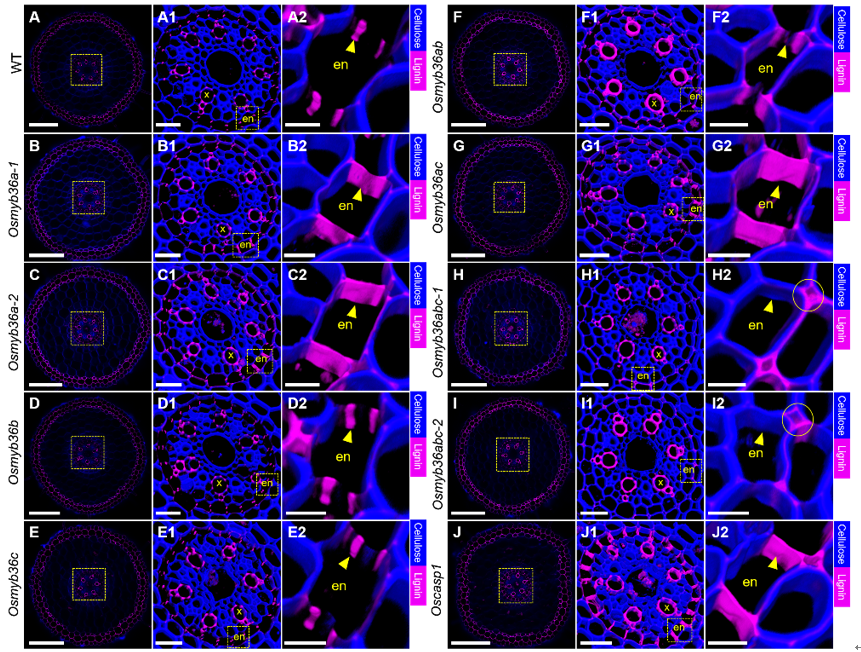 图1 野生型和OsMYB36突变体根内皮层凯氏带形成的横切面观察