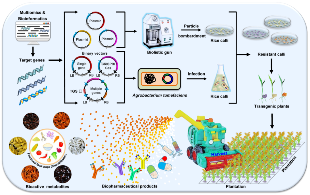 生物反应器是指利用微生物、动物或植物细胞为代谢反应场所生产目标产物的生物工程系统。而利用基因工程方法,在植物生产各种重要的目标产物,可称为植物分子农场【1】。目前,随着经济水平的日益提高,人们对具有更高营养成分或生物活性物质的功能性粮食作物的需求越来越迫切。近年来,植物合成生物学与基因编辑技术(如多基因堆叠系统和基因编辑系统CRISPR/Cas)的发展,促进了多种复杂的功能性生物活性物质在植物中的合成生产。而传统的植物分子农场(通常用常规基因工程方法表达少数基因,主要用于生产医用蛋白等)已不能满足日益发展的需求。为此,该综述将分子农场概念从主要生产医用蛋白拓展到开发具有营养素和生物活性物质的功能性作物领域,并以水稻胚乳为例介绍了分子农场的发展现状和未来方向(如图1)。