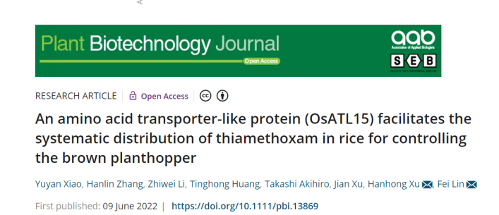 近日,华南农业大学亚热带农业生物资源与利用国家重点实验室、天然农药与化学生物学教育部重点实验室徐汉虹与林菲课题组在Plant Biotechnology Journal杂志上发表题为“An amino acid transporter-like protein (OsATL15) facilitates the systematic distribution of thiamethoxam in rice for controlling the brown planthopper”的研究论文,该研究克隆了噻虫嗪高效利用吸收转运蛋白基因OsATL15,并对其潜在的分子机制和应用价值进行了初步探究。该成果开创性地从农药与作物互作的角度提高农药对靶传递效率,为以农药高效利用为目标性状的水稻分子设计育种提供了重要的研究思路和基因资源。