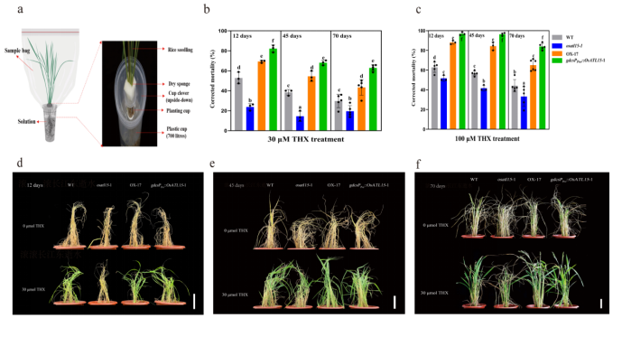 作者模拟根部施药场景探究噻虫嗪施用于不同OsATL15基因型水稻植株对褐飞虱防治效果。结果表明,根部施用30 μM噻虫嗪后,相对野生型株系,其在OsATL15过表达和gdcsPro::OsATL15植株上的防效显著提高,验证了农药在病虫害为害部位特定分布积累,从而提高对害虫防治效果的设想。