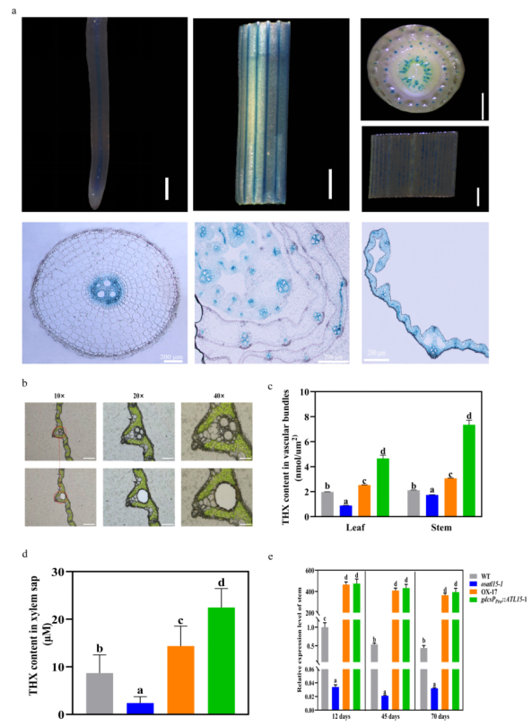 该研究利用富集表达水稻转运蛋白基因的酵母文库筛选出了水稻噻虫嗪转运蛋白基因OsATL15。过表达OsATL15明显增强了水稻对噻虫嗪的吸收。作者利用启动子gdcsP构建韧皮部特异表达OsATL15的水稻植株,通过融合GUS标签以及组织化学检测发现,gdcsPpro::OsATL15-GUS在根的木质部、韧皮部、中柱鞘和内皮层以及茎和叶的维管束中表达(图1a)。利用激光显微切割技术对不同基因型OsATL15植株的维管束组织进行切割分离以及噻虫嗪含量检测,数据表明gdcsPro::OsATL15植株微管束积累的噻虫嗪含量最高(图1b和1c),这正是褐飞虱等刺吸式口器害虫取食的部位。