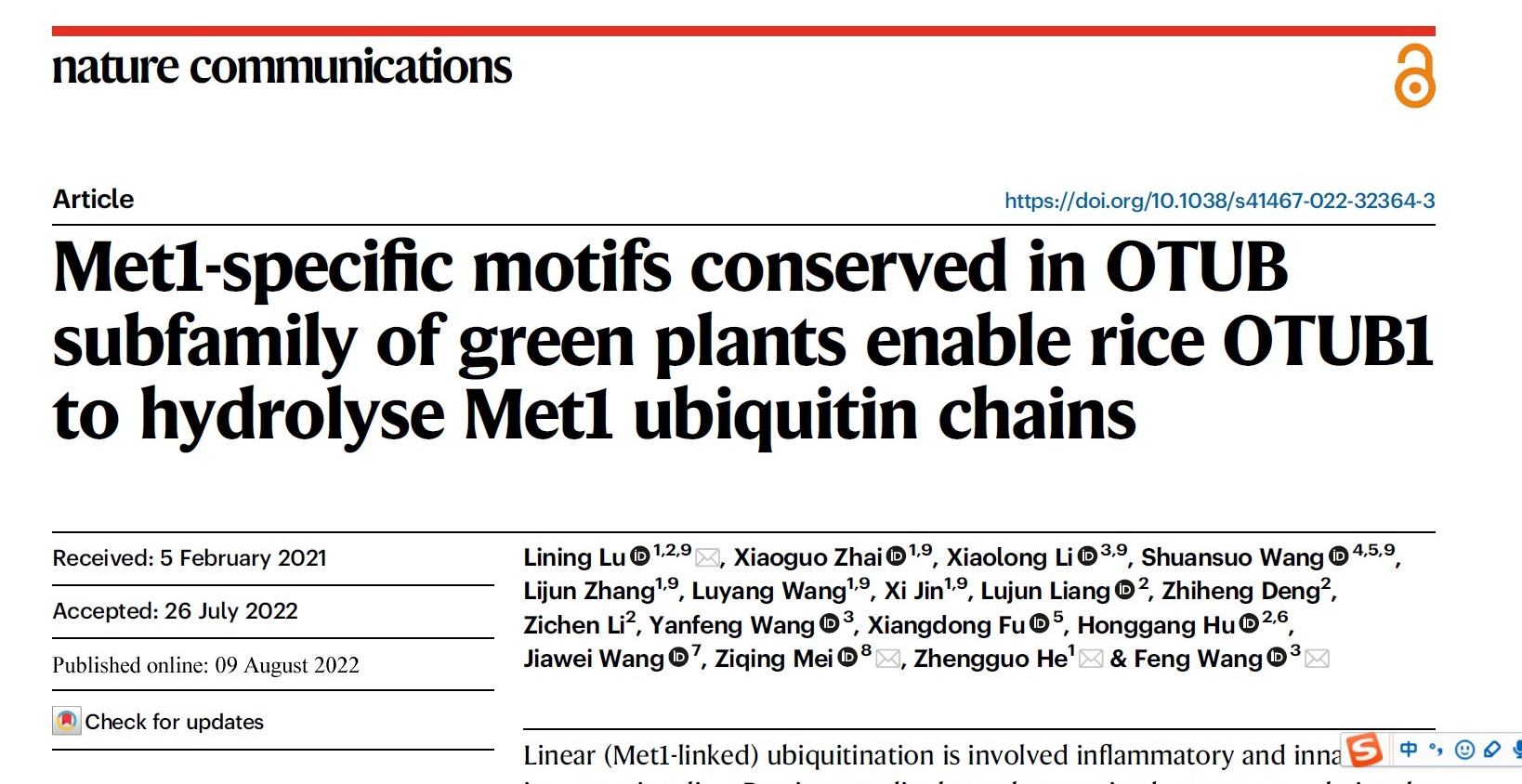 8月9日,我校生命科学与技术学院、亚热带农业生物资源保护与利用国家重点实验室何正国教授领衔的合成生物学团队与北京理工大学和北京科技大学相关团队合作联合在国际著名学术期刊《自然-通讯》(Nature Communications)发表题为《绿色植物OTUB亚家族中保守的Met1特异性基序使水稻OTUB1能够水解Met1泛素链》(Met1-specific Motifs conserved in OTUB subfamily of green plants enable rice OTUB1 to Hydrolyse Met1 Ubiquitin Chains)的研究论文。英国上市公司365为论文的第一完成单位和共同通讯作者单位。该工作在国际上首次揭示了水稻去泛素化酶OTUB1水解Met1泛素链的分子机制,发现了跨物种范围OTUB亚家族成员水解Met1泛素链的分子开关。