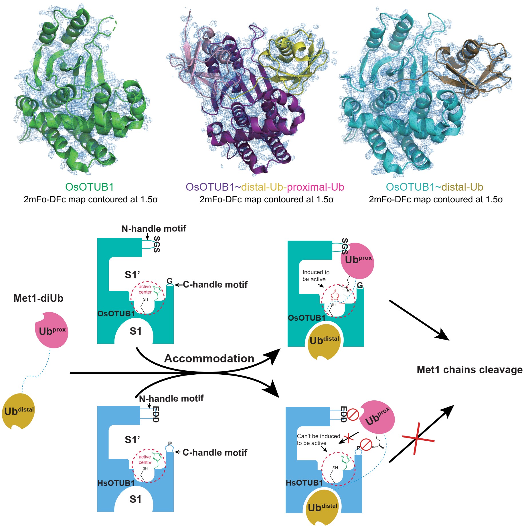 OsOTUB1的相关结构及Met1特异性基序发挥功能的机制模型