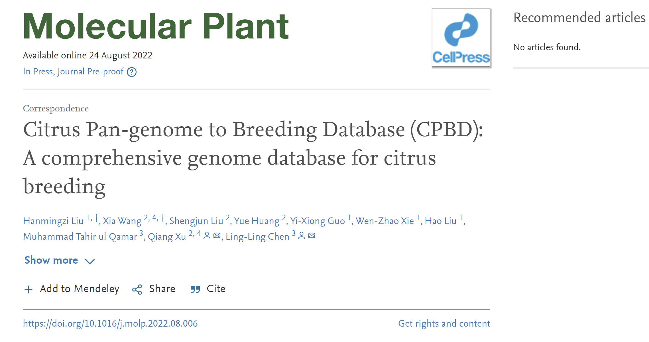 近期,我室陈玲玲教授课题组和华中农业大学徐强教授课题组在Molecular Plant在线发表题为“Citrus Pan-genome to Breeding Database (CPBD): A comprehensive genome database for citrus breeding”的数据库文章,整合了柑橘属下多个物种的基因组、转录组、变异组和表观组的数据,开发相关在线工具,为柑橘的理论和育种研究提供了重要平台。
