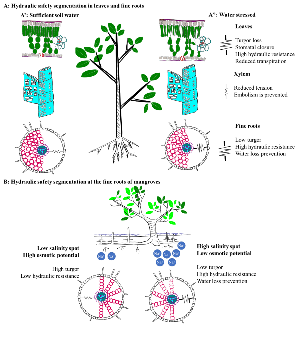 研究人员比较研究了喀斯特、红树林和不缺水的同质园三种不同生境中木本植物细根和叶片对缺水的脆弱性,验证假说:细根膨压的损失点发生在茎木质部栓塞和叶片膨压损失点之前,从而保护茎干和粗根运输通道免受水力失败甚至崩溃的风险。他们测量了三个生境共37种木本植物叶片和细根的压力-容积曲线、以及其中17种枝条木质部栓塞脆弱性,对比分析了器官间的水分关系和水力性状,探讨它们对生长生境适应特点。结果表明:(1) 37种木本植物中,有32种植物细根丧失膨压的水势高于其叶片,即土壤水分亏缺时细根首先失去膨压,与土壤分离,防止土壤向植物体夺水。细根萎蔫水势发在枝条木质部损失50%导水率的水势之前,从而防止木质部运输组织发生严重气穴栓塞。(2) 与喀斯特植物和同质园植物相比,红树植物叶片肉质化,具有高抗萎蔫特性、高储水能力和较低比叶面积,它们的细根也一定程度肉质化,具有较高比根长和水容,柔软而细长的细根利于红树植物根系寻找盐度较低的微生境。(3) 喀斯特植物叶片多为硬叶,具有高弹性模量和低水容,它们的细根抗萎蔫能力强。