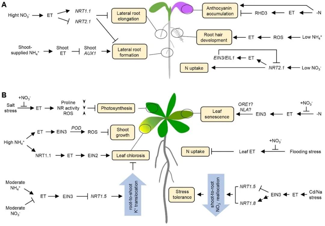 图1. 乙烯介导植物苗期(A)和成株期(B)氮反应