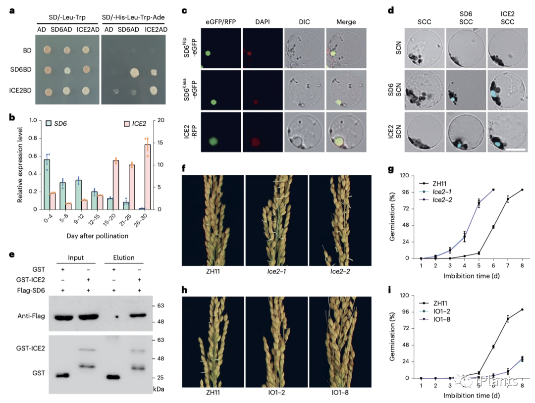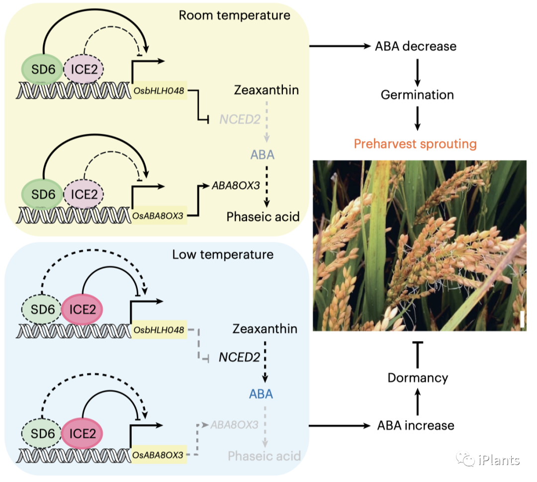 进一步研究表明,SD6通过特异性识别ABA分解代谢基因ABA8OX3启动子中的G-box基序并激活其表达来负调节水稻种子休眠。此外,SD6相互作用蛋白ICE2特异性识别ABA8OX3启动子中的E-box基序并抑制其表达,从而增强种子休眠。同时该研究还发现存在SD6/ICE2-OsbHLH048-NCED2级联调节水稻种子休眠。与其拟南芥同系物AtbHLH57相比,OsbHLH048在调节水稻种子休眠方面具有相反的功能。因此,该研究结果揭示了一对拮抗性TFs的新范式,该TFs通过平衡种子休眠和发芽的不同机制同时调节植物激素的生物合成和降解。