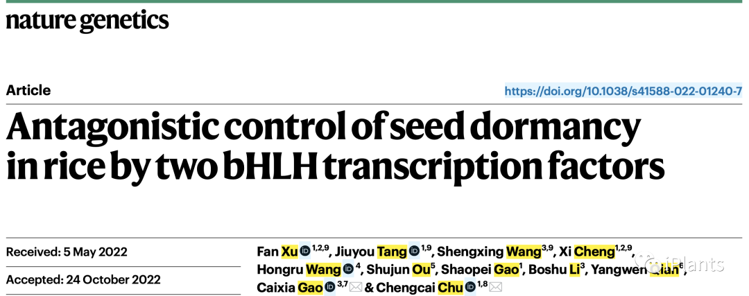 2022年12月5号,Nature Genetics杂志在线发表了来自中国科学院遗传与发育研究所储成才课题组(现为华南农业大学亚热带农业生物资源保护与利用国家重点实验室)/高彩霞组合作题为“Antagonistic control of seed dormancy in rice by two bHLH transcriptionf actors”的研究论文,该研究鉴定到控制种子休眠和萌发新基因,揭示了种子为什么要休眠的科学问题。