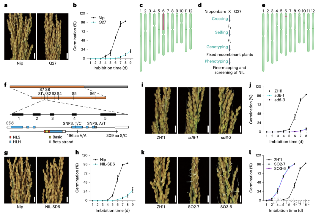 该研究为了鉴定水稻种子休眠自然变异的基因,筛选了几种染色体单节段替代系(CSSSL),这些系来自弱休眠品种Nipponbare和强休眠品种Kasalath之间的杂交。然后选择其中一个品系Q27进行进一步分析,Q27新鲜收获的种子表现出接近Kasalath的休眠状态,被称为SD6。进一步对SD6进行精细定位,表明SD6编码基本的螺旋 - 环 - 螺旋(bHLH)转录因子,这是种子休眠自然变异的基础。