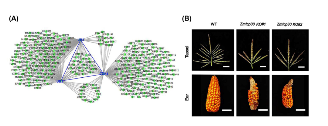 图2 (A)UB2/UB3/TSH4作为网络中心调节玉米花序发育, (B)Zmtcp30 CRISPR/Cas9突变体表型分析