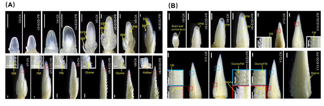 为了探索高密度种植对玉米花序发育的影响,研究人员在白天结束后进行远红光(EOD-FR)和白天正常光照中补充远红光 (WL+FR)处理来模拟避荫条件,并对玉米雄穗(V3-V9)和雌穗(V8-V12)的连续发育阶段进行了系统研究。研究人员利用体视显微镜系统观察揭示,模拟遮荫处理有效地加速了茎尖顶端分生组织(shoot apical meristem,SAM)向花序分生组织(inflorescence meristem, IM)转变,导致了雄穗和雌穗中各类型分生组织的提早发育。