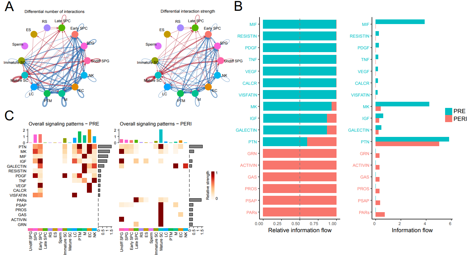 精子发生负责精准代际传递父源基因组的遗传信息,涉及睾丸微环境调节的复杂发育过程。特异性的分子标记基因区分了不同发育阶段的微环境体细胞,它们通过分泌信号转导对于精子发生过程中不同阶段的生精细胞的贡献不同。特别注意的是,由CLDN11标记的成熟睾丸支持细胞(Mature SC)占据了5条分泌信号通路的最强贡献者,说明其处于睾丸细胞通讯网络的中心地位(图3)。该研究还通过检查配体-受体互作对,揭示体细胞通过旁分泌/自分泌信号在水牛精子发生过程中的全局分子“微环境”。