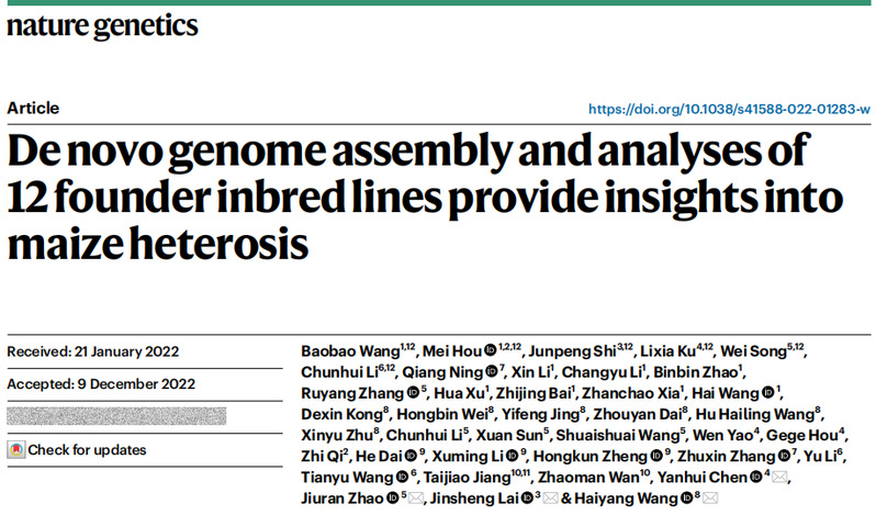 2023年1月17日,华南农业大学亚热带农业生物资源保护与利用国家重点实验室、生命科学学院王海洋教授团队联合中国农业科学院生物技术研究所等单位科研团队完成的论文“De novo genome assembly and analyses of twelve founder inbred lines provide insights into maize heterosis” 在线发表在国际顶尖学术期刊 “Nature Genetics”上。该研究在构建玉米核心自交系泛基因组、解析玉米杂种优势形成机理方面取得重大进展。
