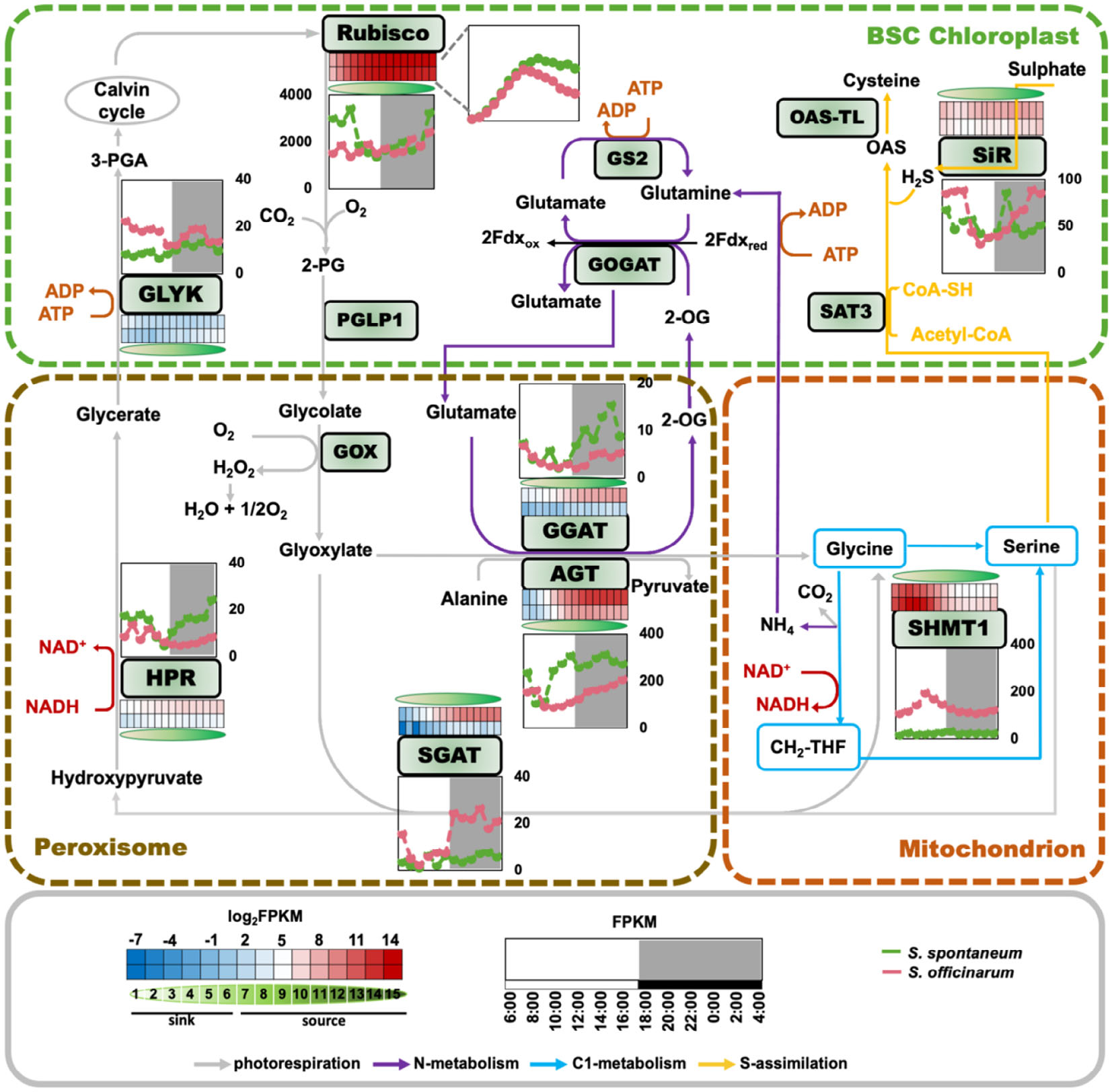 为进一步探究差异形成的主要机制,该研究通过对叶片发育区段进行主要功能区划分,并对昼夜节律进行表达节律和相位分析,借助共表达网络的共识矩阵和代谢组学数据,绘制了甘蔗光呼吸代谢草图,其中光呼吸途径中的七个基因:RBCS,甘油酸激酶(GLYK),羟基丙酮酸还原酶(HPR),谷氨酸:乙醛酸氨基转移酶(GGAT),AGT,SHMT1和亚硫酸盐还原酶(SiR)呈现出不同的昼夜节律表达模式。值得注意的是,RBCS在高贵种中没有表现出明显的昼夜节律,这表明与割手密种相比,RBCS对割手密种的昼夜节律更为敏感。利用TO-GCN识别RBCS的上游调节因子,结果发现两个甘蔗种之间没有共享的调节因子。因此,Rubisco的差异调节可能造成了两个甘蔗种光合作用能力的差异。