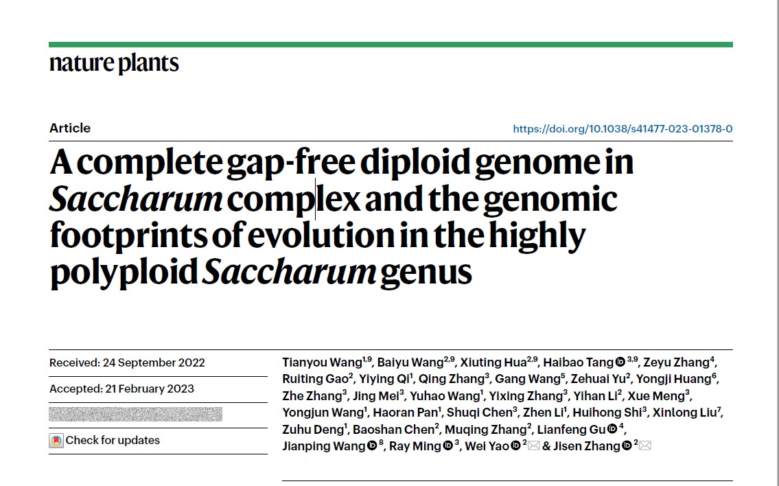 2023年3月30日,Nature Plants在线发表了甘蔗属复合体高质量T2T完整基因组及甘蔗属的演化,该成果是张积森课题组继前期解析甘蔗首个基因组(Zhang et al., Nature Genetics. 2018)、阐明割手密种种质资源演化,系统解析高贵种和割手密种中的关键农艺性状相关基因的基因组学差异 (Zhang et al., Nature Genetics. 2022)后,在甘蔗基因组学领域的又一重大进展。该研究组装完成了蔗茅T2T完整基因组,阐明了着丝粒的演化、蔗茅与甘蔗的分化、一对古复制染色体对(5号和8号染色体)的演化模式及甘蔗属的起源和演化,为甘蔗分子育种和甘蔗种质资源研究奠定了重要基础。