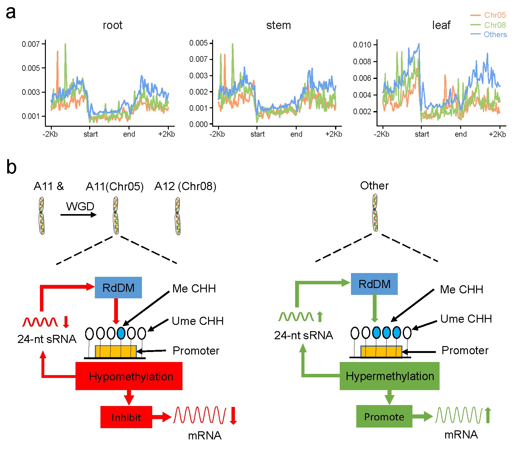 本文研究发现一对古复制染色体5号和8号染色体上的基因整体趋向于低表达,值得重点指出的是,进一步的研究发现,这种现象在甘蔗属乃至禾本科中都是普遍存在的。通过甲基化测序和sRNA测序分析表明,24nt sRNA介导的甲基化(RdDM)差异,特别是基因启动子区域CHH甲基化差异,是导致该对染色体基因表达量降低,从而保持基因表达剂量平衡的调控机制。同时研究还还发现该对染色体上的基因存在协同进化现象,并富集了大量NBS抗病基因。