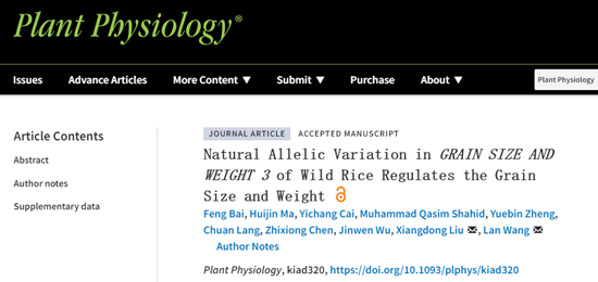 近日,华南农业大学农学院刘向东/王兰团队在水稻粒型研究方面取得新进展,在中科院一区TOP期刊Plant Physiology (影响因子8.005)发表了题为“Natural Allelic Variation in GRAIN SIZE AND WEIGHT 3 of Wild Rice Regulates the Grain Size and Weight”的研究论文。