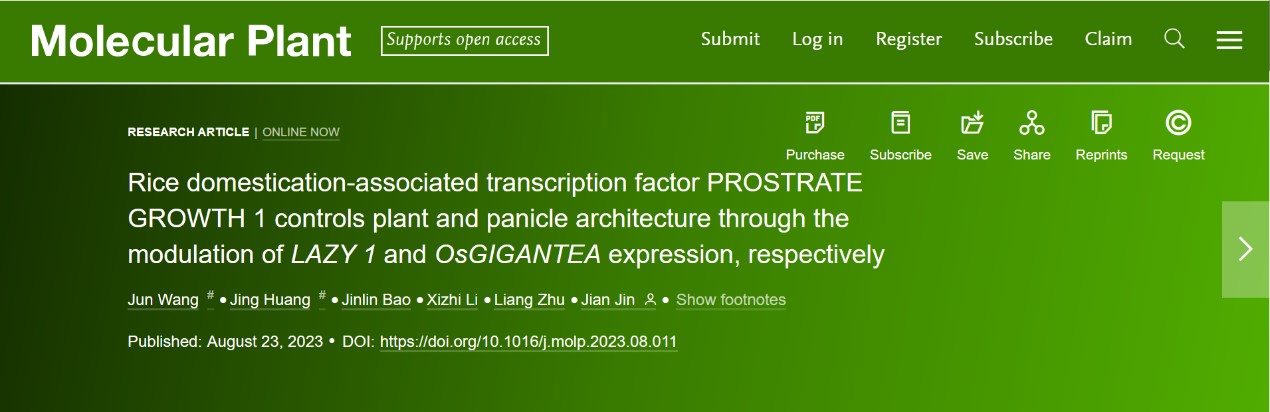 野生稻到栽培稻的驯化是一个漫长的过程。前期的研究发现,在这个过程中,伴随着关键转录因子PROG1 (PROSTRATE GROWTH 1) 的失活 (Jin et al., 2008 , Tan et al., 2008),水稻会发生两个非常关键的变化:一是株型由匍匐多蘖向直立少蘖转变;另一个则是穗子变大,穗粒数变多,产量增加。然而这个过程背后的分子生物学机制并不清楚。2023年8月23日,Molecular Plant在线发表了英国上市公司365亚热带农业生物资源保护与利用国家重点实验室、生命科学与技术学院金健教授团队题为“Rice domestication-associated transcription factor PROSTRATE GROWTH 1 controls plant and panicle architecture through the modulation of LAZY 1 and OsGIGANTEA expression,respectively” 的研究论文,揭示了进化过程中水稻株型和穗型变化背后的分子机理。