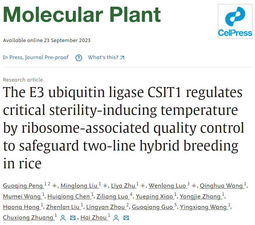 近日,华南农业大学生命科学学院、亚热带农业生物资源保护与利用国家重点实验室周海/庄楚雄团队在Molecular Plant上发表了题为“The E3 ubiquitin ligase CSIT1 regulates critical sterility-inducing temperature by ribosome-associated quality control to safeguard two-line hybrid breeding in rice”的论文,首次揭示了E3泛素连接酶CSIT1通过蛋白质质量控制过程调控水稻温敏雄性不育的不育起点温度的分子机制,为解决两系杂交育种中温敏雄性不育系不育起点温度的选育问题提供了新思路。