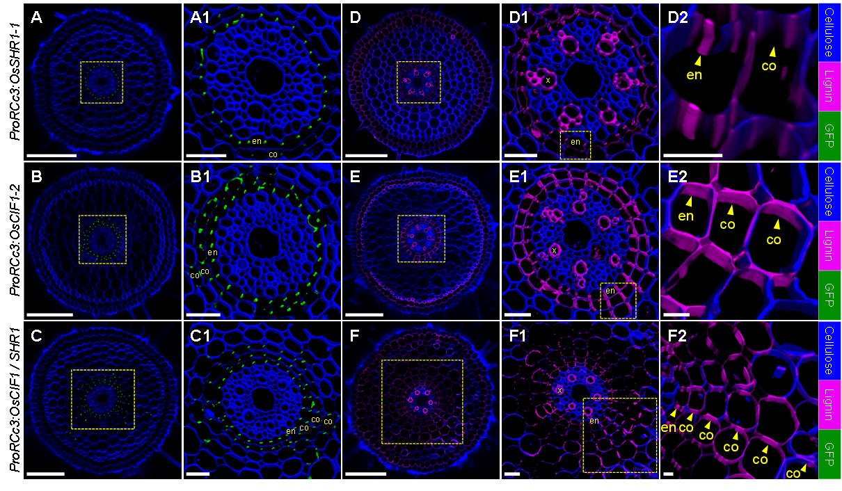 该研究发现在水稻基因组中含有三个编码CIF小肽基因(OsCIF1a、OsCIF 1b、OsCIF2)和两个编码类受体激酶SGN3基因(OsSGN3a、OsSGN3b)。OsCIFs主要积累在中柱中,而OsSGN3s特异性定位于内皮层凯氏带区。同时突变三个OsCIFs或两个OsSGN3s都导致内皮层产生不完整的凯氏带,同时异位的木质素和木栓质在内皮层累积也显著减少。与此相反,异位过表达OsCIF1或OsCIF2能够在邻近内皮层的多层皮层细胞诱导出完整凯氏带结构以及细胞层的过度木质化和木栓化(图1,2)。并且,同时过表达OsCIF1和OsSHR1能够诱导更多细胞层产生凯氏带结构(图1)。转录组分析进一步发现了112个受OsCIF1/2-OsSGN3信号调控的下游基因,包括控制凯氏带和木栓层形成的一些关键基因,例如OsMYB36a、OsCASP1、OsMYB41/93(图2)。另一方面,OsMYB36a/b/c能够调控OsSGN3b和OsSGN1s的表达水平(图2)。此外,在过表达OsCIFs植株中,OsSHR1、OsSHR2以及OsSCRs等凯氏带形成的关键调控基因表达量也显著增加。这些结果说明OsCIF1/2-OsSGN3a/b信号通路与转录因子OsSHR-OsSCR-OsMYB36a/b/c调控网络协同控制或诱导水稻根中内皮层和非内皮层凯氏带的形成(图2)。本研究不仅完善了水稻内皮层凯氏带形成的基因调控网络,而且为未来利用CIF信号途径在其他非内皮层细胞间构建凯氏带结构来调控植物对养分的选择性吸收提供了重要的理论参考。