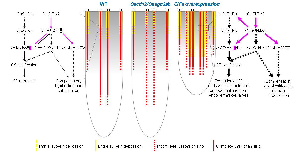 小肽是一类广泛存在于真核生物、长度通常为2~100个氨基酸的信号分子,能被相应的细胞质膜类受体激酶识别结合并介导细胞间、组织间以及器官间的信号转导过程。近年来,研究发现小肽作为信号分子广泛参与植物的生长发育、免疫及环境适应性的调控。凯氏带是高等植物内皮层细胞径向壁和横向壁上木质化和木栓化的带状增厚结构,在根的养分选择性吸收中扮演着重要角色。拟南芥凯氏带完整因子AtCIF小肽和类受体激酶AtSGN3被报道参与调控根内皮层凯氏带的完整性。然而,在水稻中CIF-SGN3介导的信号如何影响凯氏带发育,其调控哪些下游基因仍然不清楚。