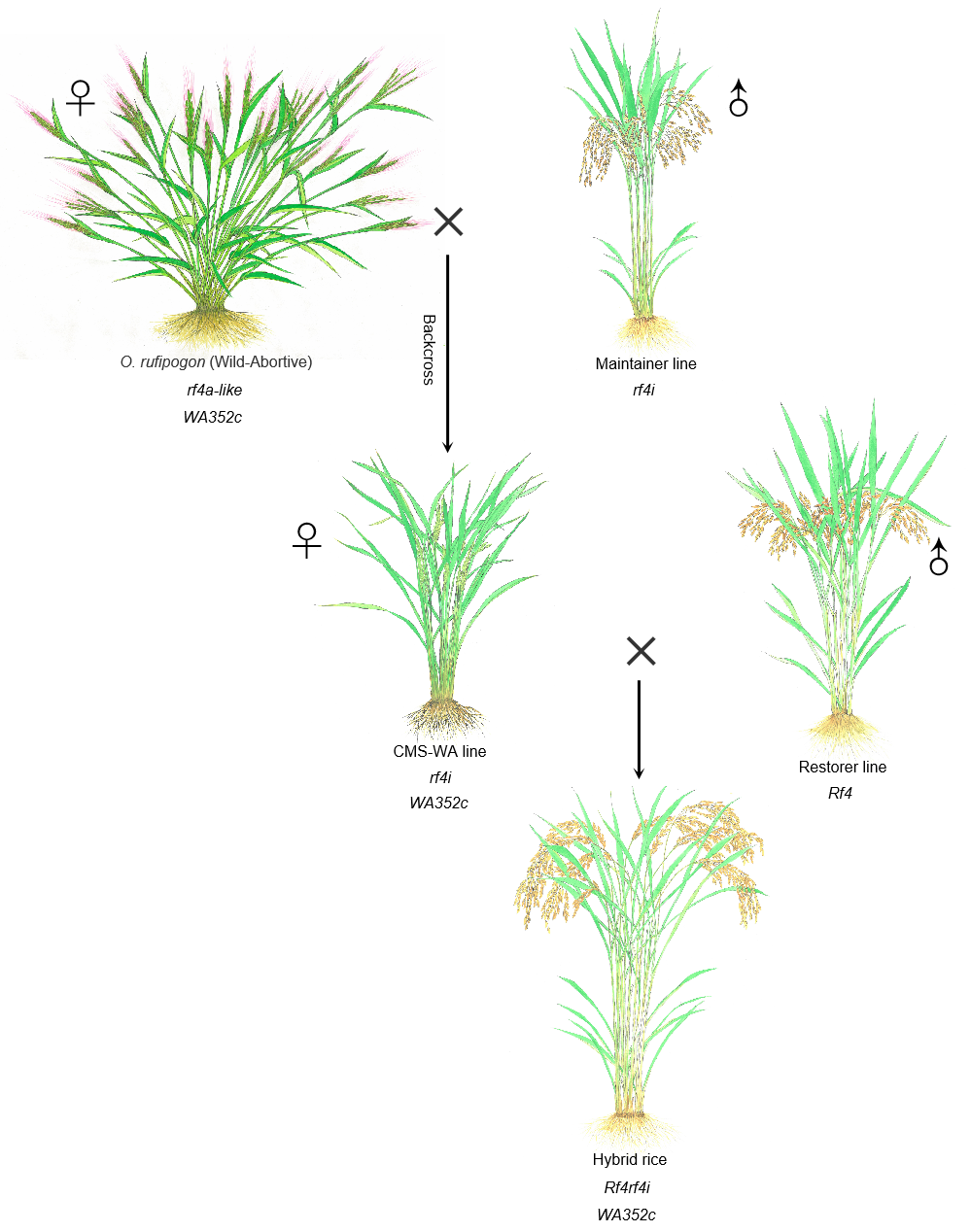 水稻细胞质雄性不育系和恢复系是实现三系杂交稻的重要遗传资源。Rf4是由我校刘耀光院士和陈乐天教授于2014年率先克隆的野败型细胞质雄性不育(CMS-WA)主效恢复基因,但Rf4在稻属中的演化规律以及CMS-WA/Rf系统的选育基础仍不清楚。陈乐天/谢勇尧课题组在后续研究中,发现Rf4座位存在拷贝数和序列变异。于是,进一步系统分析了720份水稻材料,其中栽培稻311份,农家种168份,野生稻241份,共鉴定出69种Rf4单倍型,从而总结出Rf4座位序列变异和拷贝数变异的规律;揭示Rf4座位在稻属进化过程中,在自然选择和人工选择作用下,Rf4座位新形成的单倍型逐渐迁移到O. rufipogon、O. nivara和O. sativa谱系,其中8种单倍型(H1-H8)最终被富集在现代栽培稻中。通过比较恢复基因Rf4与不育基因WA352c的进化关系,发现在野生稻中Rf4座位起源早于WA352c;并还原了杂交稻育种50年来,CMS-WA/Rf4系统人工选择的分子基础和选择路径。