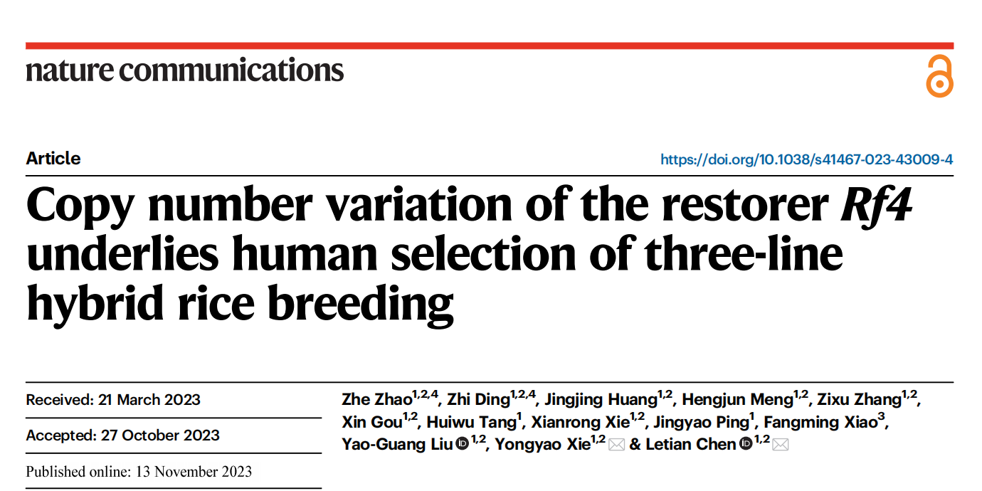 2023年11月14日,亚热带农业生物资源保护与利用国家重点实验室、华南农业大学生命科学学院陈乐天/谢勇尧课题组在Nature Communications(影响因子16.6)在线发表了题为Copy number variation of the restorer Rf4 underlies human selection of three-line hybrid rice breeding的研究论文。该论文阐明了Rf4座位在稻属起源、进化和拷贝数变异的规律,揭示了三系杂交稻应用过程中,CMS-WA/Rf4系统人工选育的分子基础,为培育强恢复系提供了新思路,为我国杂交稻的可持续发展提供了理论基础。