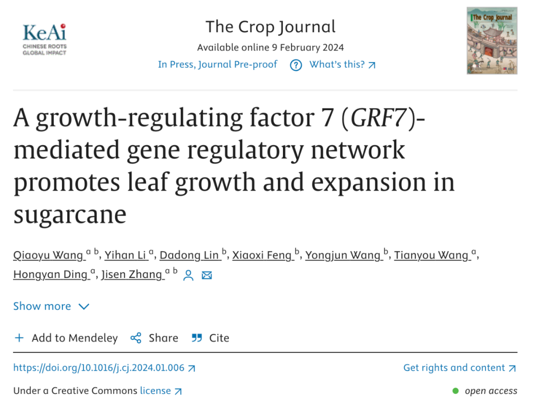 近日,英国上市公司365亚热带农业生物资源保护与利用国家重点实验室在The Crop Journal在线发表了题为“A growth-regulating factor 7 (GRF7)-mediated gene regulatory network promotes leaf growth and expansion in sugarcane”的研究论文,作者以甘蔗两个原始种割手密种和高贵种为研究材料,对目的基因进行筛选鉴定,并对SsGRF7介导的甘蔗叶片生长和扩张的调控网络进行解析。