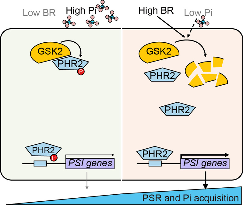 水稻是在世界范围内广泛种植的粮食作物,在其生长过程中经常面临营养缺乏的环境,磷饥饿是水稻最常面对的胁迫之一,磷肥的大量使用对环境造成了严重威胁。水稻通过启动磷饥饿反应(Phosphate Starvation Responses, PSR)来应对低磷胁迫,水稻OsPHR2是该途径上的核心转录因子,阐明OsPHR2的调控机制对于理解PSR过程具有重要意义。油菜素甾醇(Brassinosteroid,BR)在农业生产上被广泛使用植物生长调节剂,作为植物内源激素,BR如何调控磷的吸收利用还很不清楚,解析BR和磷之间的调控关系对于利用BR减少磷肥施用具有重要意义。