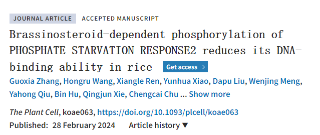2024年2月29日,国际著名学术期刊《The Plant Cell》在线发表了我室储成才教授团队的研究论文“Brassinosteroid-dependent phosphorylation of PHOSPHATE STARVATION RESPONSE2 reduces its DNA-binding ability in rice” (Doi: 10.1093/plcell/koae063)。华南农业大学博士后张国霞为论文第一作者,储成才教授和中国农业科学院作物科学研究所童红宁研究员为论文共同通讯作者,我室谢庆军教授、胡斌教授等参与了该项工作。该研究得到广东省基础与应用研究重大专项、国家自然科学基金、中国农业科学院创新工程等项目的资助。