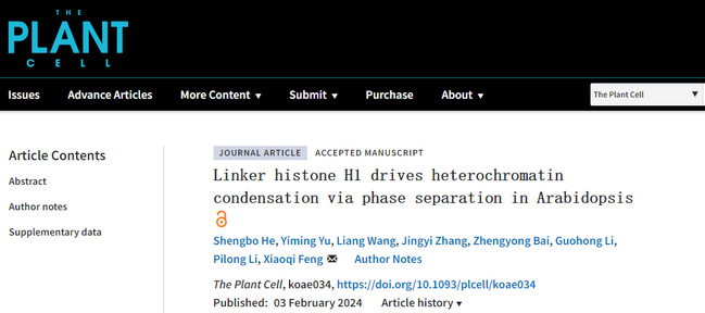 近日,我室赫圣博教授在The Plant Cell在线发表了题为“Linker histone H1 drives heterochromatin condensation via phase separation in Arabidopsis”的研究论文。文章报道了组蛋白H1通过相分离机制驱动植物异染色质浓缩。