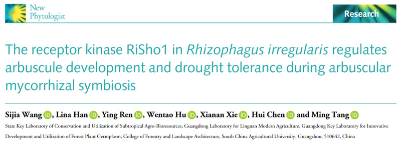 近日,我室华南农业大学唐明教授团队在New Phytologist上发表了题为“The receptor kinase RiSho1 in Rhizophagus irregularis regulates arbuscule development and drought tolerance during arbuscular mycorrhizal symbiosis”的研究论文。该论文揭示了丛枝菌根真菌异形根孢囊霉(Rhizophagus irregularis)受体激酶RiSho1提高宿主植物耐旱性的分子机制,为丛枝菌根真菌增强植物抗旱能力提供理论依据。