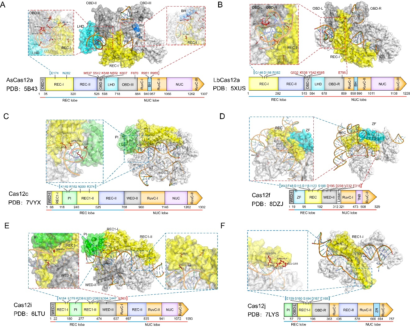 图3. V型效应器工程改造的现状。A. AsCas12a 的工程化改造 B. LbCas12 的工程化改造。 C. Cas12c 的工程化改造。 D. Cas12f 的工程化改造。 E. Cas12i 的工程化改造。某些氨基酸无法在 PDB 数据库的蛋白质模型中显示。