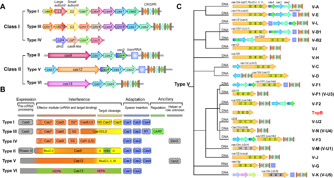图1. 各类CRISPR系统的特点及Type V CRISPR系统的系统发育树。A. CRISPR Class I和Class II基因座中元件的一般分布图。B. CRISPR系统中不同类型蛋白质所需的组分及其特性。C. CRISPR Class II type V家族的系统发育树,包括RuvC活性结构域的氨基酸 (Asp-Glu-Asp, DED) 。