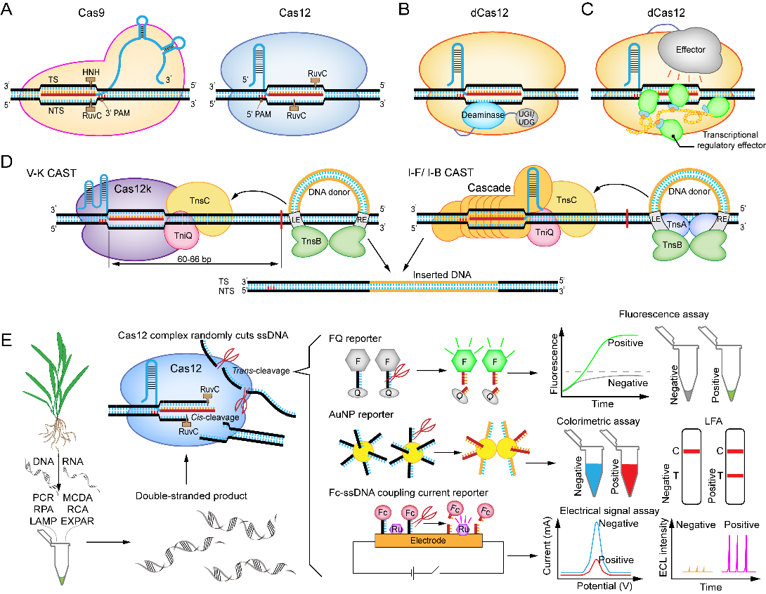 图4. Type V 型效应器的生物学应用。A. Type V效应子(Cas12蛋白)和Cas9蛋白之间的差异。 B. 基于Cas12的碱基编辑工具原理。 C.基于Cas12的基因表达调控原理。 D. CRISPR 相关转座酶 (CASTs) 的原理。 E. 基于 Cas12 的植物生物传感器。