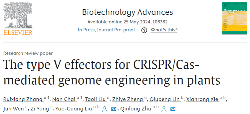 近日,亚热带农业生物资源保护与利用国家重点实验室、岭南现代农业科学与技术广东省实验室、生命科学学院和农学院刘耀光院士/祝钦泷研究员团队在生物工程领域国际著名期刊《Biotechnology Advances》(IF=16.0,中科院一区,生物工程领域排名4/158)在线发表了题为“The type V effectors for CRISPR/Cas-mediated genome engineering in plants”的研究综述(论文链接:https://www.sciencedirect.com/science/article/pii/S0734975024000764)。文中系统综总结了V型效应蛋白(CRISPR/Cas12)的结构特征、新效应蛋白的挖掘方法、效应器的工程化改进策略,及其在动物和植物基因编辑中的应用发展,为CRISPR/Cas12在作物遗传改良和提高农业生产等方面的应用,提供了研究思路与有益的参考。