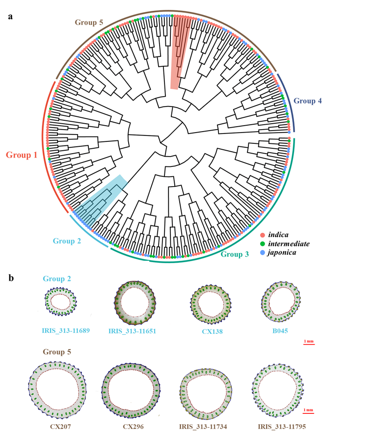 研究一共对14个茎秆性状开展了分析,并将该水稻资源群体分为5组(图1)。第1组和第2组分别为籼稻和粳稻类型。第4组和第5组的维管束数目、维管束面积、茎直径、茎周长等性状显著高于其他组,而第2组维管束数目、维管束面积、茎秆直径、空腔面积、皮面积等性状显著低于其他组。维管束性状在籼粳水稻间出现了一定的分化。