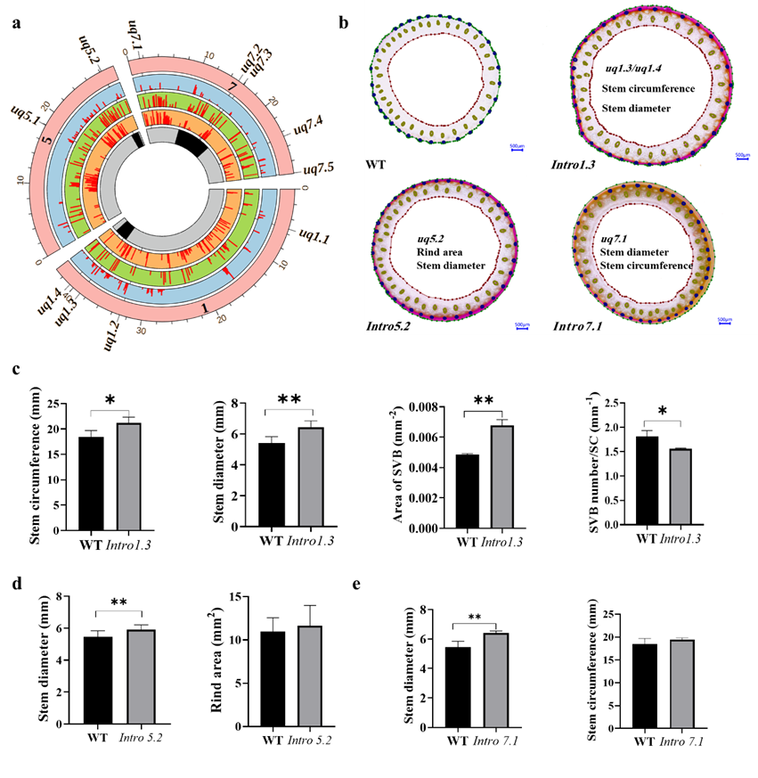 利用水稻染色体片段置换系)(CSSL)对其中4个QTLs进行了验证(图2)。研究表明,Intro1.3的茎秆直径、茎秆周长、小维管束面积显著高于受体亲本,小维管束数目与茎秆周长比值显著低于受体亲本。Intro5.2和Intro7.1茎秆直径显著高于受体亲本。这些显著的表型差异和QTL定位的性状一致。